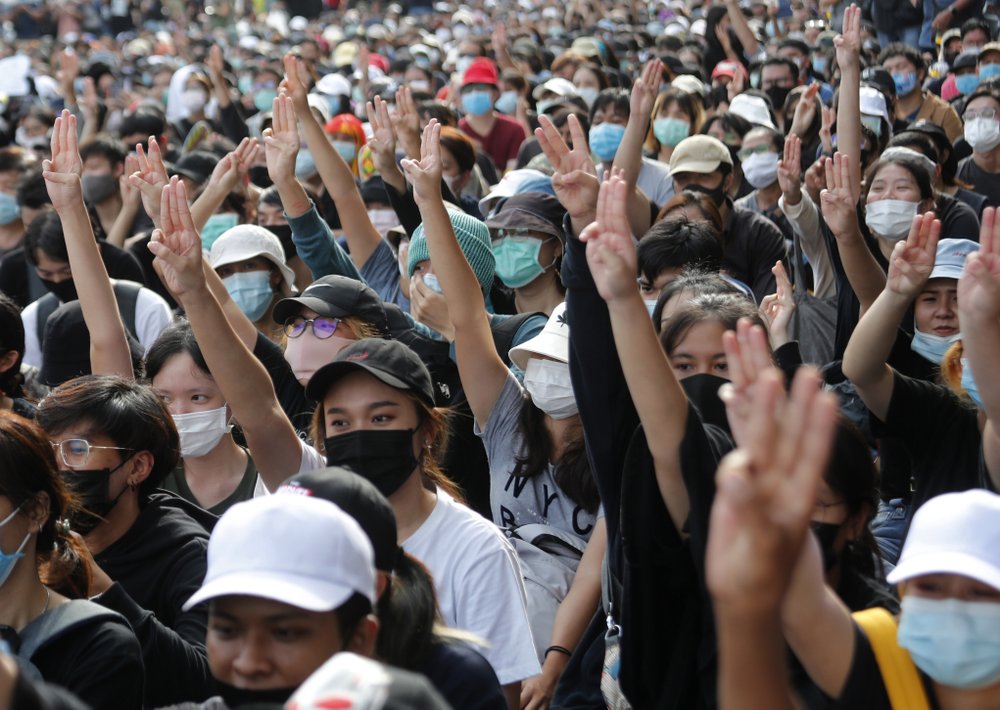 Pro-democracy students raise three-fingers, symbol of resistance salute, during a rally in Bangkok, Thailand.