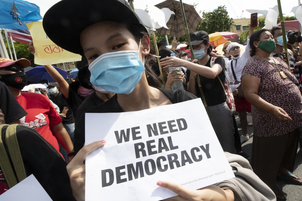 A pro-democracy student holds a poster during a rally in Bangkok, Thailand, Sunday.