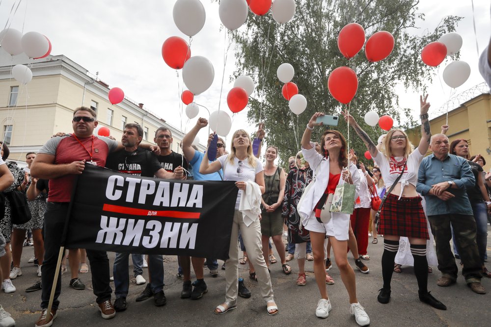 Several dozen people also gathered in front of a detention center in Minsk where Tsikhanouskaya’s husband Sergei, a popular opposition blogger who planned to run for president himself, is being held. Tsikhanouskaya entered the race after he was jailed. The crowd cheered to mark his 42nd birthday.