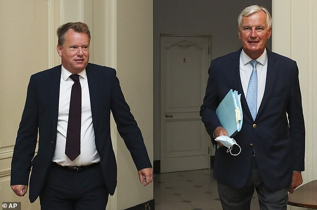 Michel Barnier, right, and David Frost arriving for Brexit trade talks last month.