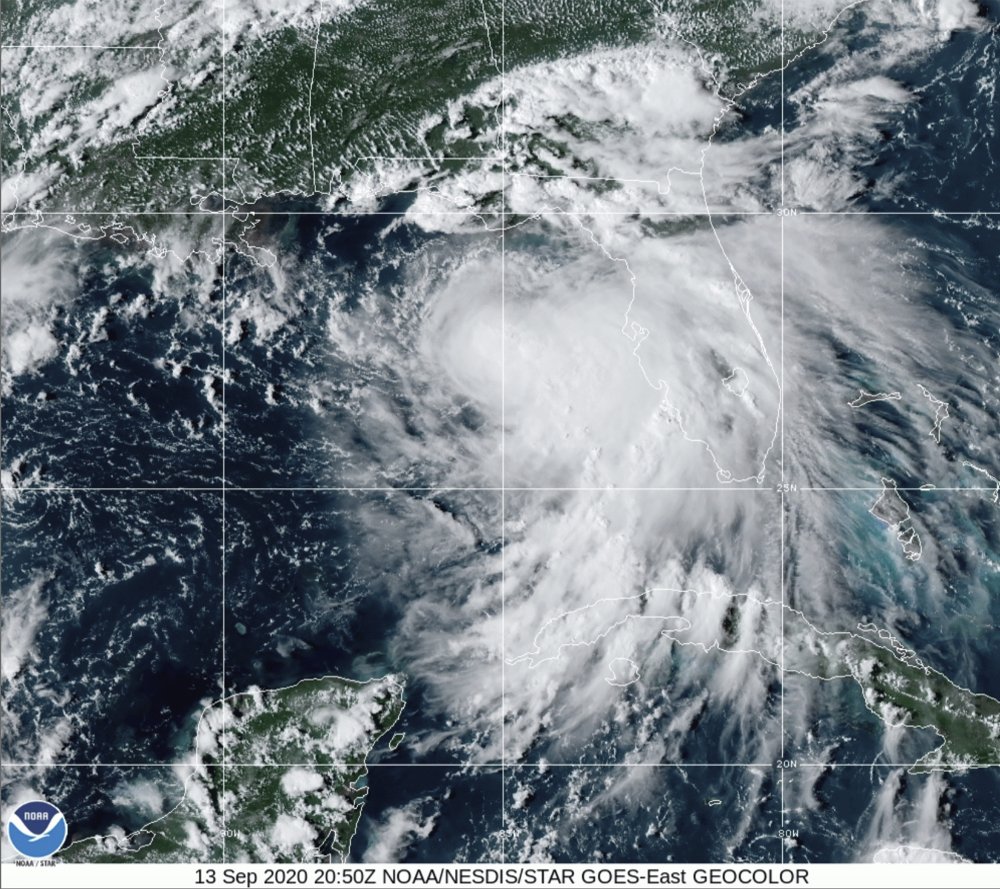 This satellite photo provided by the National Oceanic and Atmospheric Administration shows tropical storm Sally, Sunday.