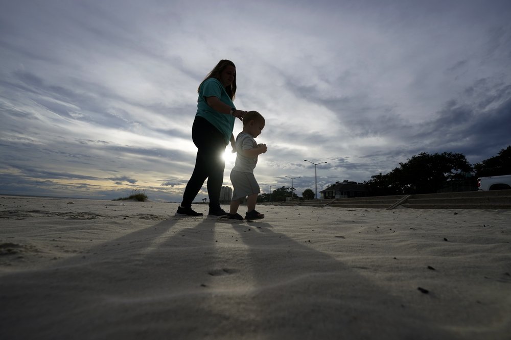 Nikita Pero of Gulfport, Mississippi, walks with her son Vinny Pero, 2, on the beach along the Gulf of Mexico in Biloxi, Miss., Monday.