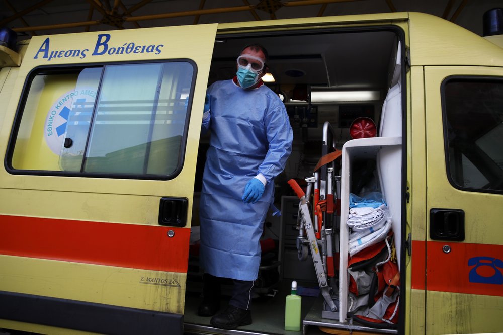 A paramedic closes the door of an ambulance at Evangelismos hospital in Athens, Thursday. Greece has imposed a nationwide nightly curfew as the number of patients in the country continues to surge.