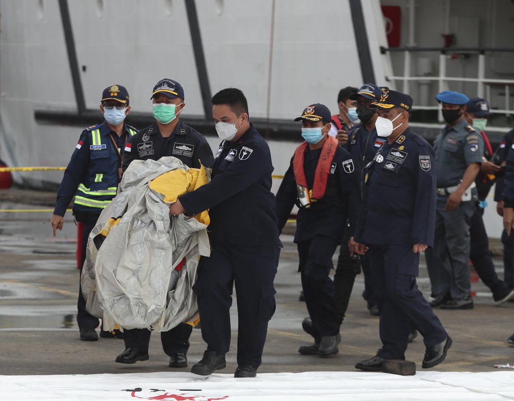 Rescuers carry debris found in the waters around the location where a Sriwijaya Air passenger plane lost contact with air traffic controllers shortly after takeoff, at the search and rescue command center at Tanjung Priok Port in Jakarta, Indonesia, Sunday, January 10, 2021. The Boeing 737-500 took off from Jakarta for Pontianak, the capital of West Kalimantan province on Indonesia's Borneo island, and lost contact with the control tower.