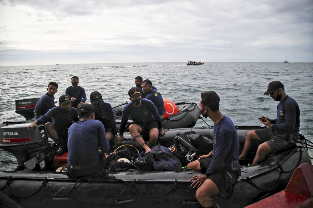 Indonesian Navy divers take part in the search for the crashed Sriwijaya Air Boeing in the waters off Java island, Indonesia, Sunday, January 10, 2021.