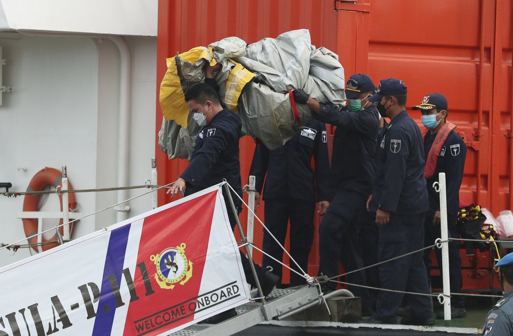 Rescuers carry debris found in the waters around the location where a Sriwijaya Air passenger plane lost contact with air traffic controllers shortly after the takeoff, at the search and rescue command center at Tanjung Priok Port in Jakarta, Indonesia, Sunday, January 10, 2021.