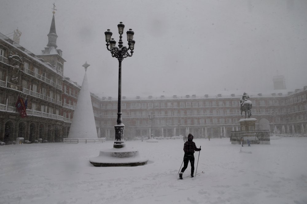 A woman skis while crossing the Plaza Mayor in Madrid during a heavy snowfall in Madrid, Spain, Saturday, January 9, 2021. An unusual and persistent blizzard has blanketed large parts of Spain with snow, freezing traffic and leaving thousands trapped in cars or in train stations and airports that had suspended all services.