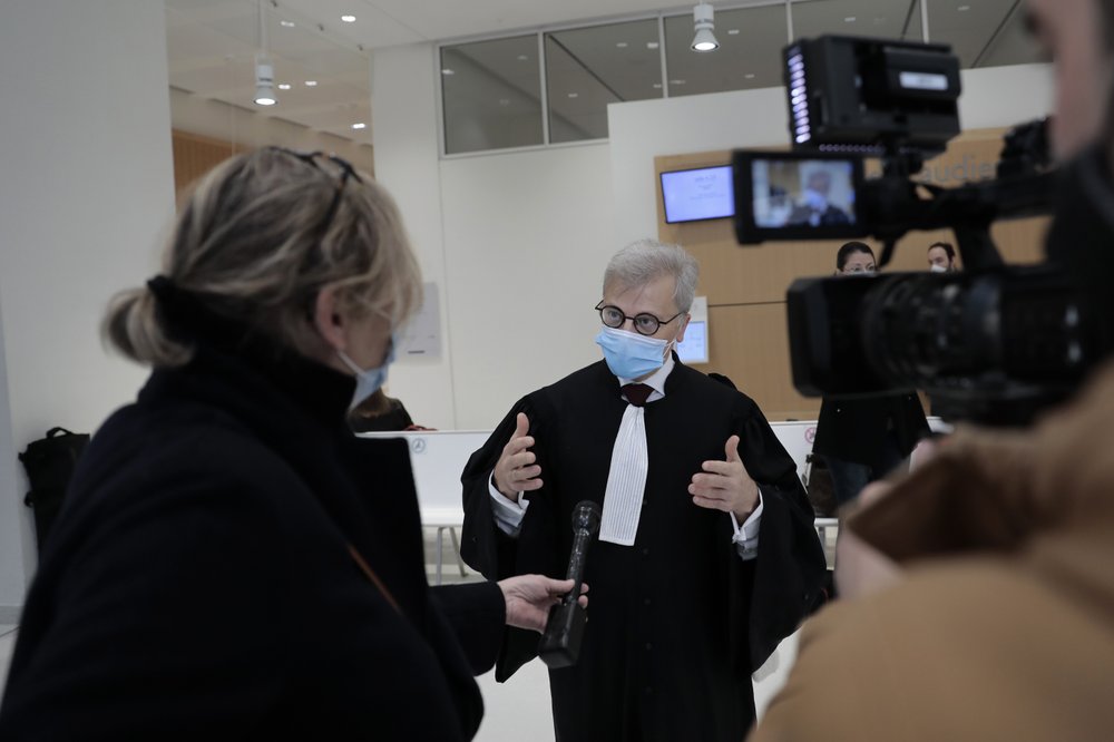 Plaintiffs lawyer Christophe Leguevaques answers reporters before the start of a hearing at the Paris palace of Justice, Wednesday, March 3, 2021.