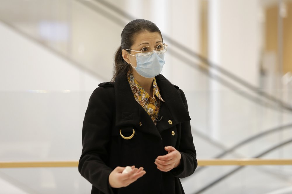 Plaintiff Sabrina Deliry arrives for a hearing at the Paris Palace of Justice, Wednesday, March 3, 2021. A Paris court holds a hearing Wednesday in a class-action effort to hold French health authorities and companies accountable after thousands of people with the virus died in nursing homes, and families were locked out and left in the dark about what was happening to their isolated loved ones.