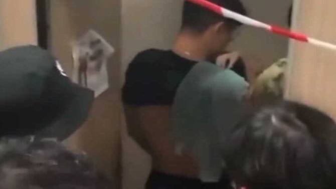 The video showed two males kneeling in a shower cubicle, naked and facing the wall, while three pairs of males, most wearing t-shirts, took turns to enter the cubicle to urinate on them.