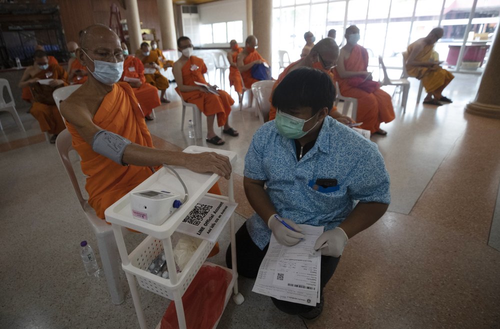 A health worker checks the blood pressure of a Buddhist monk who received AstraZeneca vaccine for side effects at Nak Prok Temple in Bangkok, Thailand, Friday, April 9, 2021.