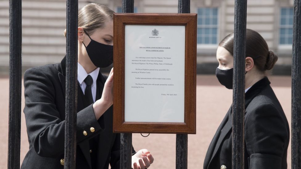The official notice of the death of the Duke of Edinburgh was placed outside Buckingham Palace for an hour.