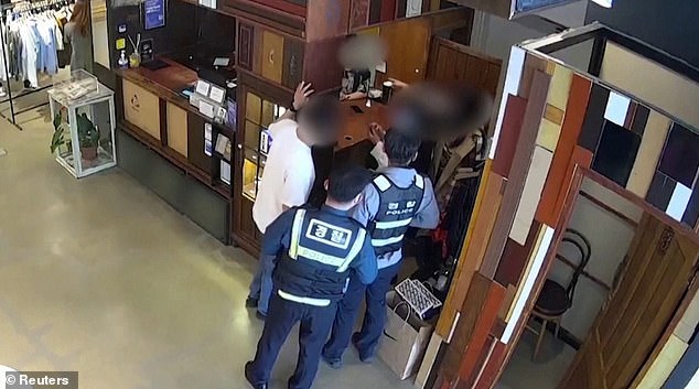 Suspect Xiang Xueqiu seen pointing a finger at the shop worker, right, who accused her of stealing clothes as a second shop worker, center, tries to calm things down.