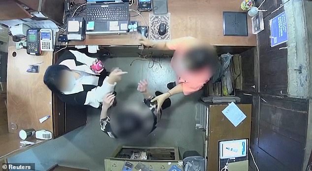 It shows a woman slapping a shopkeeper who had tried to stop her from approaching another worker.