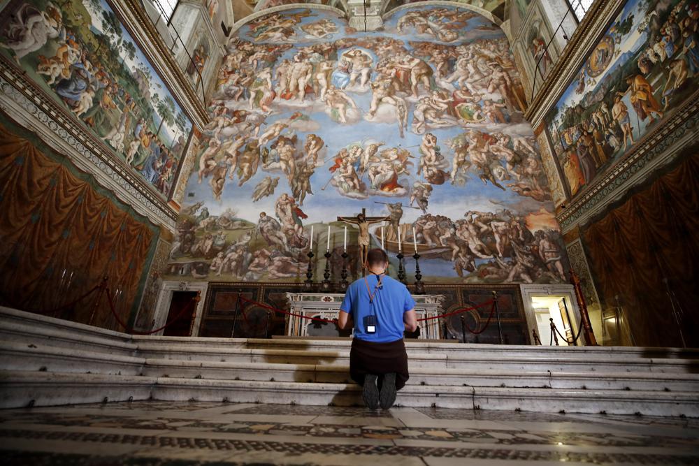 A visitor kneels in front of the Last Judgement fresco by the Italian Renaissance painter Michelangelo inside the Sistine Chapel of the Vatican Museums on the occasion of the museum's reopening, in Rome, Monday, May 3, 2021.