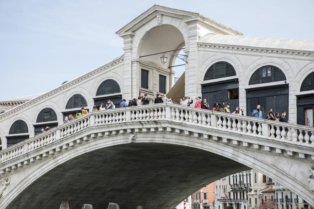 Visitors at the Rialto bridge in Venice, northern Italy, Saturday, May 1, 2021. Italy is gradually reopening after six months of rotating virus closures allowing outdoor dining.