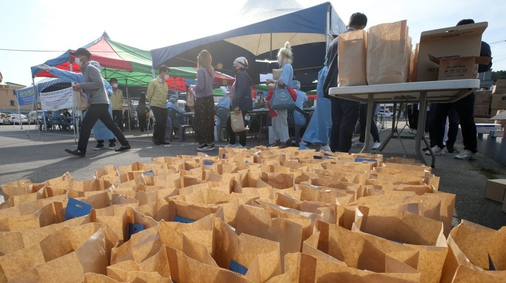 Paper bags that contain bread, masks and disinfectants for foreigners undergoing coronavirus disease tests in Gangneung, 240 kilometers east of Seoul.