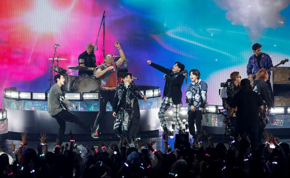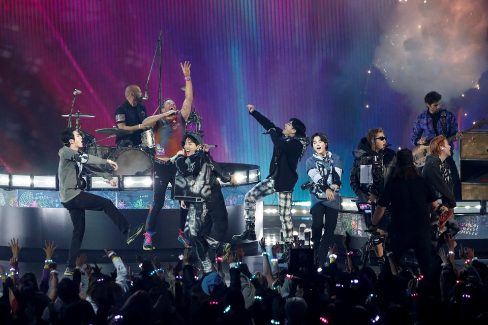 BTS joined Coldplay on stage for a rendition of their single "My Universe" in a post-pandemic return to live performances for the K-pop band, whose single "Butter" ruled the Billboard singles charts in the U.S. for 10 weeks this summer.