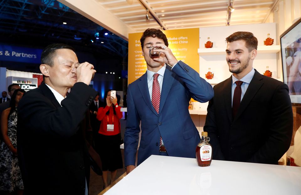 Canada's Prime Minister Justin Trudeau and Alibaba founder Jack Ma try a sample of maple syrup. (Reuters)