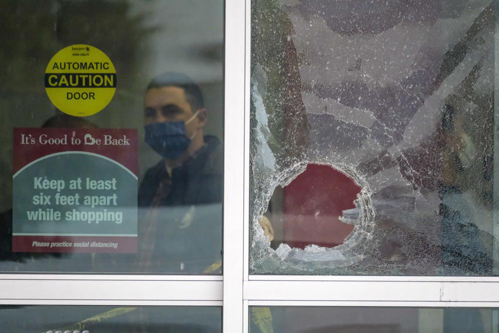 A police officer works behind a broken glass door at the scene where two people were struck by gunfire in a shooting at a Burlington store. (AP)