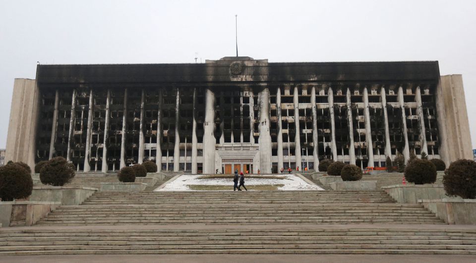 A view shows the city administration headquarters, which was set on fire during recent protests in Almaty, Kazakhstan. (Reuters)