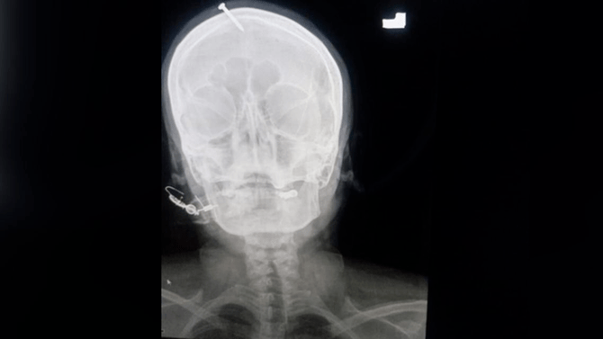 An X-ray showed the five-centimeter (two-inch) nail had pierced the top of the woman’s forehead but missed her brain. (Twitter)