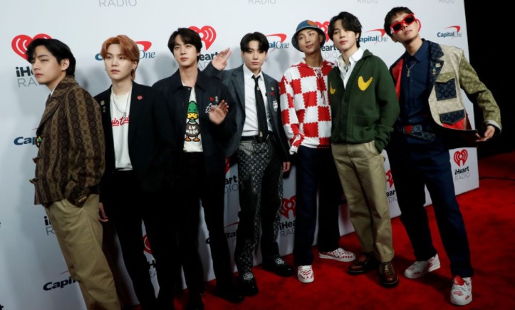 BTS poses at the carpet during arrivals ahead of iHeartRadio Jingle Ball concert. (Reuters)