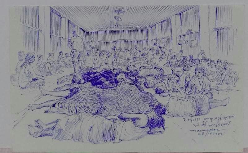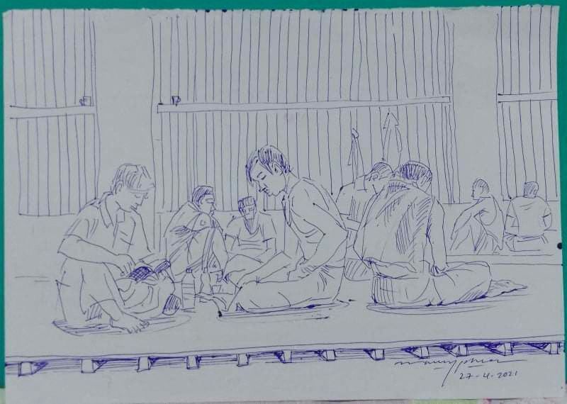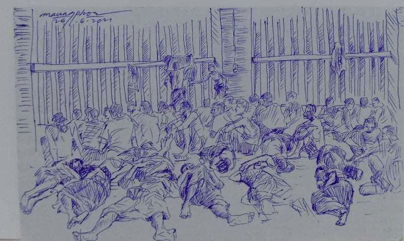Nyi Nyi Htwe, who met the artist in prison, said he sketched prisoners if asked and drew prison scenes wherever he went, saying he felt more relaxed while drawing. He gave Nyi Nyi Htwe the sketches as a birthday present.