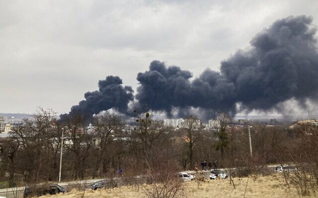 Smoke billows from the Pidzamche neighborhood after explosions were heard in the western Ukrainian city of Lviv. AFP