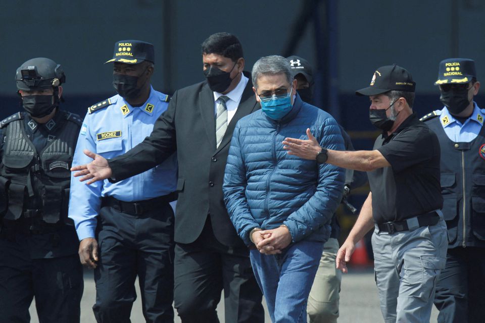 In the Honduran capital Tegucigalpa, the handcuffed ex-president was escorted to the airport by a phalanx of security forces. Around the airport, dozens of people gathered waving the country's blue and white flag to celebrate Hernandez's extradition.