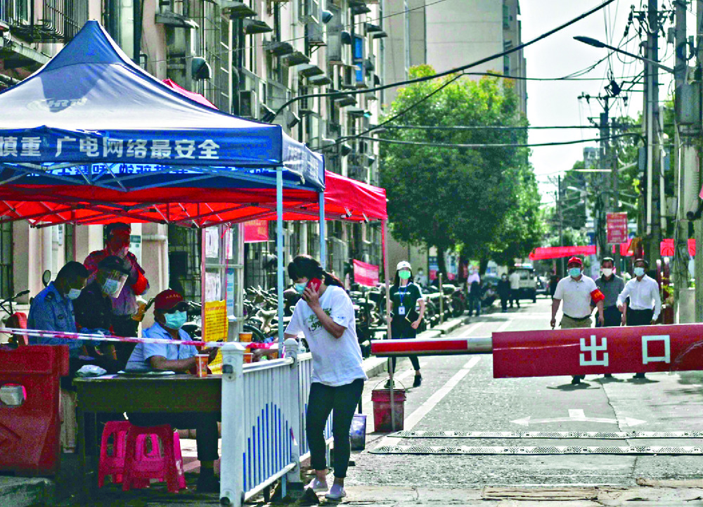 Security personnel stand outside a residential compound in Wuhan where new cases of Covid-19 were detected over the weekend. AFP