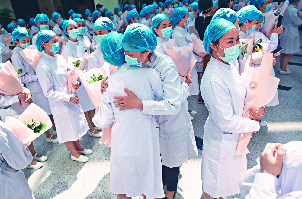 Nurses embrace during a ceremony marking International Nurses Day at Tongji Hospital, where frontline hospital staff are constantly facing risks from the new coronavirus outbreak. AFP