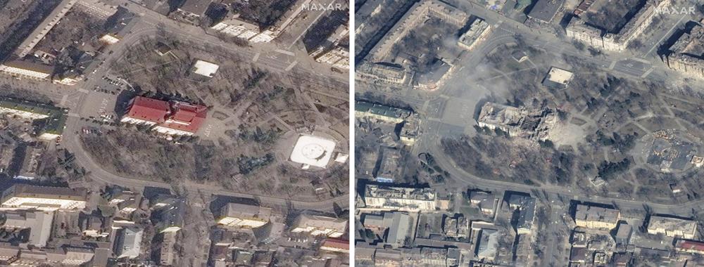 Donetsk Academic Regional Drama Theatre in Mariupol, Ukraine, on March 14, 2022, left, before the Russian bombing and after on March 29. The bombing occurred on March 16 and stands out as the single deadliest known attack against civilians to date in the war in Ukraine. (AP)
