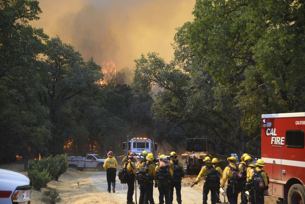 A Cal Fire hand crew arrives to the Rices Fire as it burns over Troost Trail, Tuesday, June 28, 2022, in rural North San Juan, Calif., above the Bridgeport Bridge State Park area. (AP)