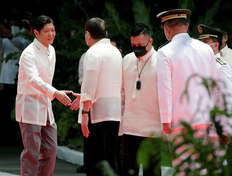 Incoming Philippine President Ferdinand 'Bongbong' Marcos Jr. shakes hands with outgoing President Rodrigo Duterte during the inauguration ceremony. (Reuters)