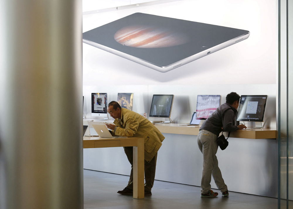 Men try apple's MacBook laptops at an apple store in Beijing, November 2, 2015. (File photo by Reuters)