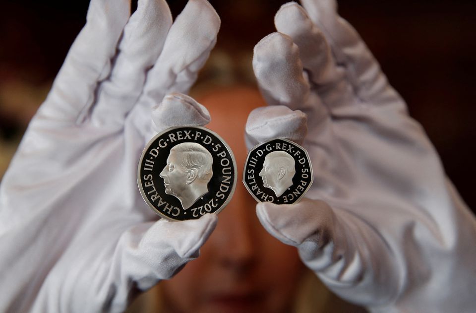 The official coin effigy of Britain’s King Charles III is seen on a £5 crown and 50 pence coin, unveiled by The Royal Mint, in London. (Reuters)