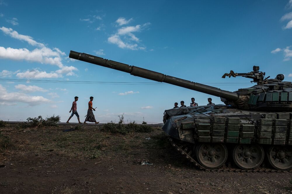Youngsters walk next to an abandoned destroyed tank south of the town of Mehoni, Ethiopia. (AFP)