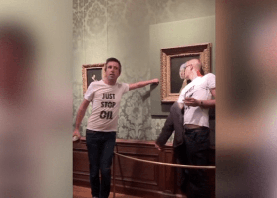 A video circulating on social media shows two men next to the priceless work of art, both of whom are wearing a t-shirt emblazoned ‘just stop oil’. One appears to have glued his hand to the wall.