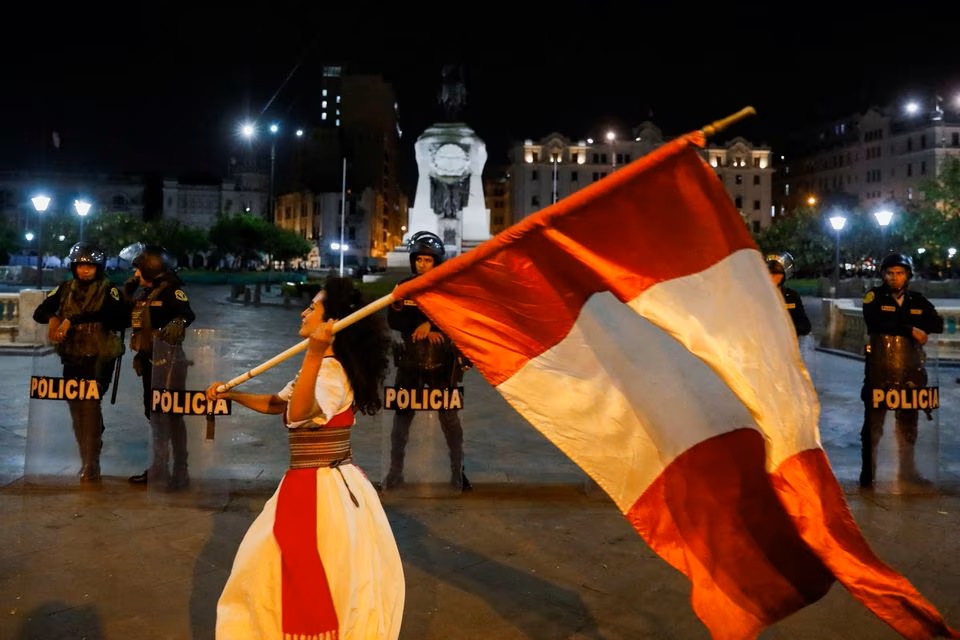 Security forces stand guard as a demonstrator waves Peru's flag during a protest to demand the dissolution of Congress and democratic elections, rejecting Dina Boluarte as Peru's president. (Reuters)