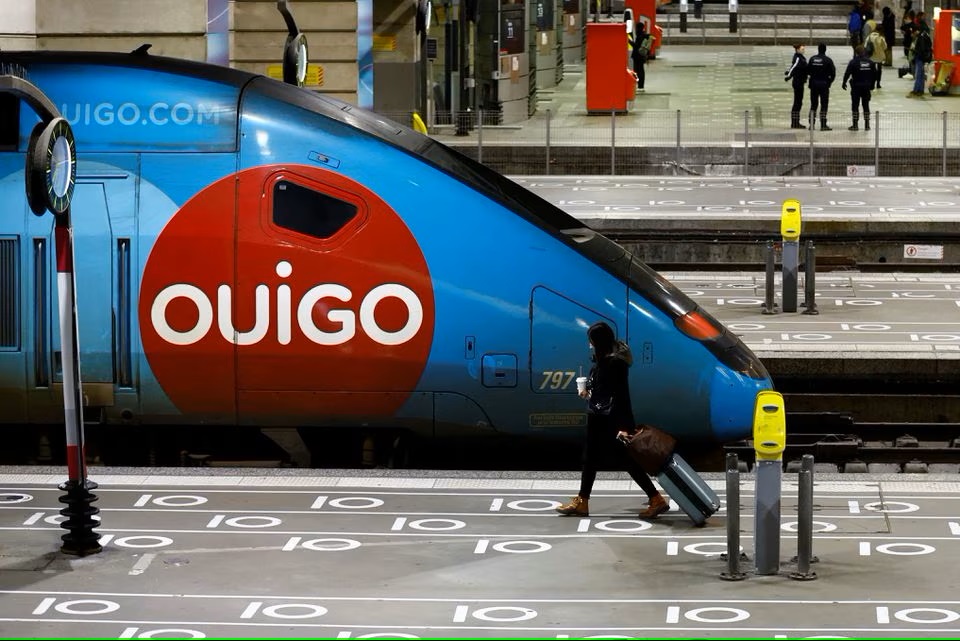 A passenger walks past a TGV Ouigo high speed train at Gare Montparnasse railway station during a strike by French SNCF workers in Paris. (Reuters)