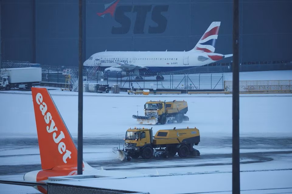 Snow ploughs clear snow from the airfield after overnight snow forced the closure of Manchester airport, in Manchester, Britain. (Reuters)