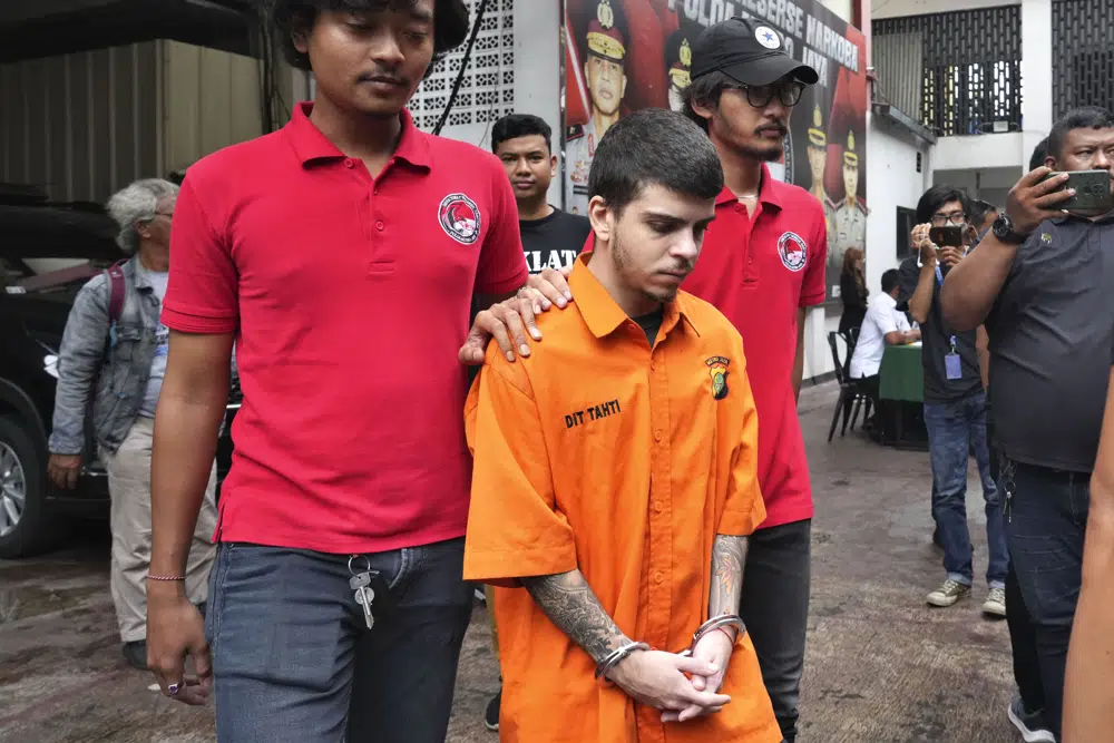Plain-clothed police officers escort Brazilian national Gustavo Pinto da Silveira prior to a press conference at the regional police headquarters in Jakarta, Indonesia, Wednesday, March 15, 2023. (AP)