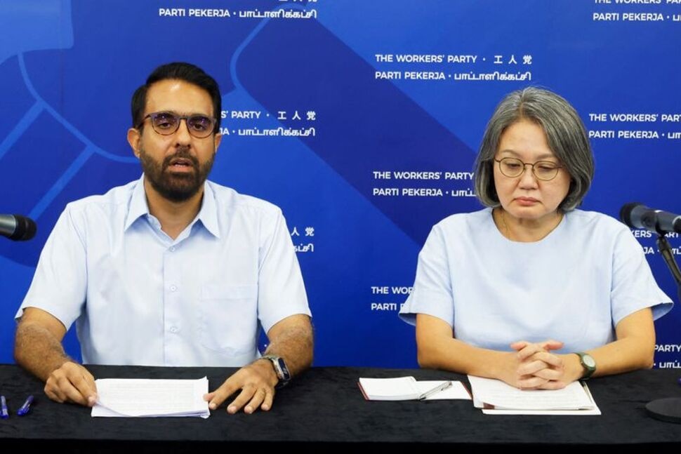 Workers' Party Chairman Sylvia Lim and Secretary-General Pritam Singh attend a press conference at their headquarters in Singapore, July 19, 2023. REUTERS/Edgar Su