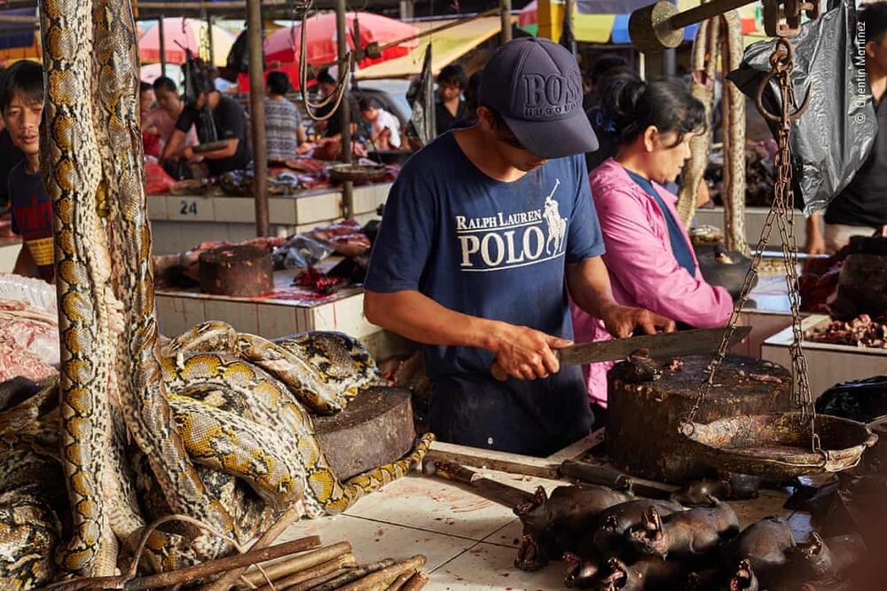 A market trader slices up fruit bats surrounded by pythons, with bamboo-skewered ‘bush’ rats beneath them, in Tomohon market Indonesia. (Twitter: @XposeTrophyHunt/ Quentin Martinez)