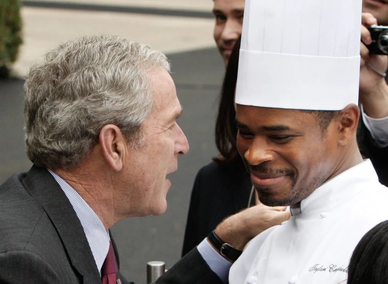 Obama’s personal chef who drowned while paddleboarding is seen with George Bush. (Twitter: @dom_lucre)