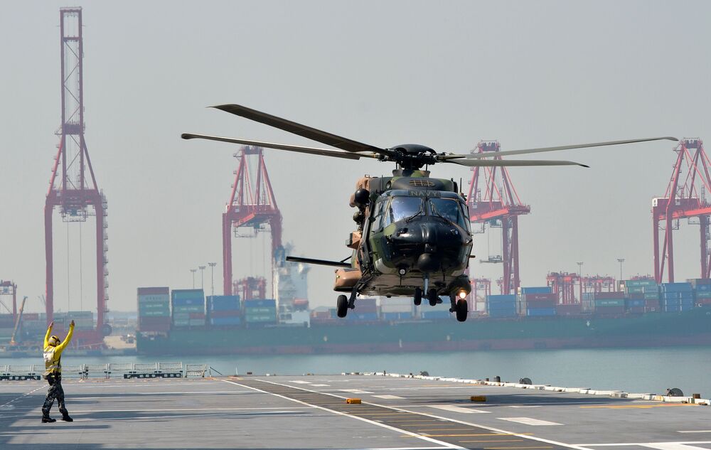 A Royal Australian Navy force NH Industries MRH-90 Multi-Role Helicopter takes off during a training exercise in the Sri Lankan capital Colombo on March 26, 2019. (AFP)