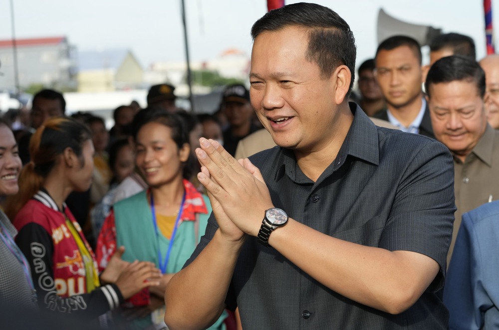 Cambodian Prime Minister Hun Manet greets garment workers at Prey Speu village outside Phnom Penh, Cambodia. (AP)