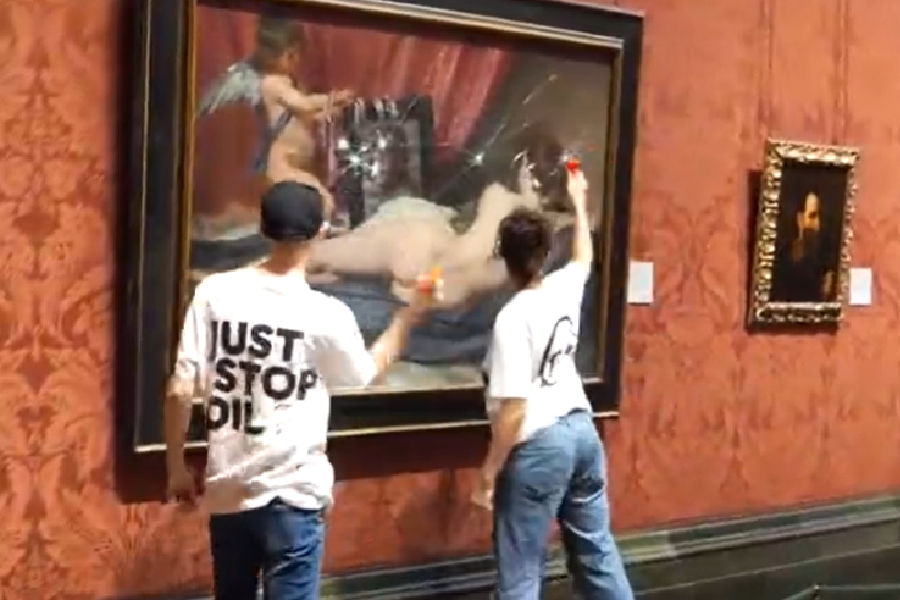 "At around 10:45 am (1045 GMT) Hanan, 22, and Harrison, 20, used safety hammers to smash the glass covering the Rokeby Venus," said the group, which is demanding a halt to all new oil and gas projects in the UK.