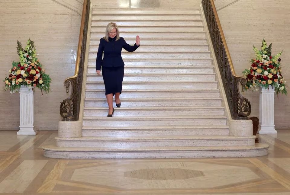 Sinn Fein Party vice president Michelle O'Neill walks at the Stormont Parliament Buildings on the day Northern Ireland lawmakers elect the Irish First Minister, in Belfast, Northern Ireland, February 3, 2024. (Reuters)